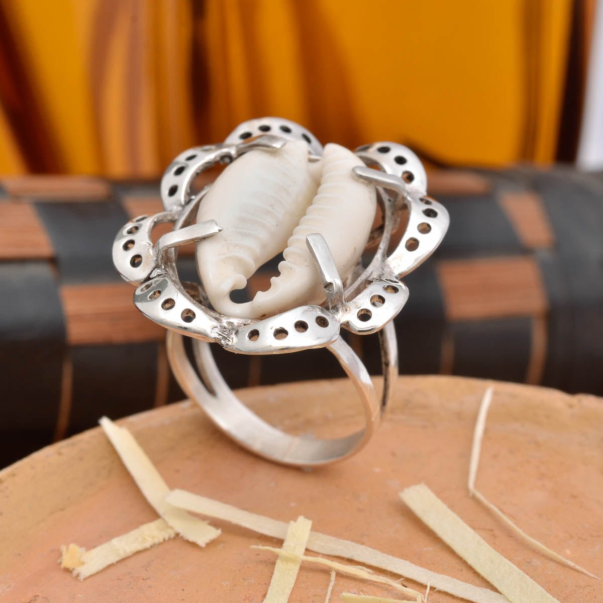 O búzio é conhecido como símbolo de prosperidade, comunicação espiritual e conexão com as águas, sendo especialmente ligado a Oxum e Iemanjá. A base em prata, com detalhes trabalhados, garante resistência e beleza para uso diário ou cerimonial.