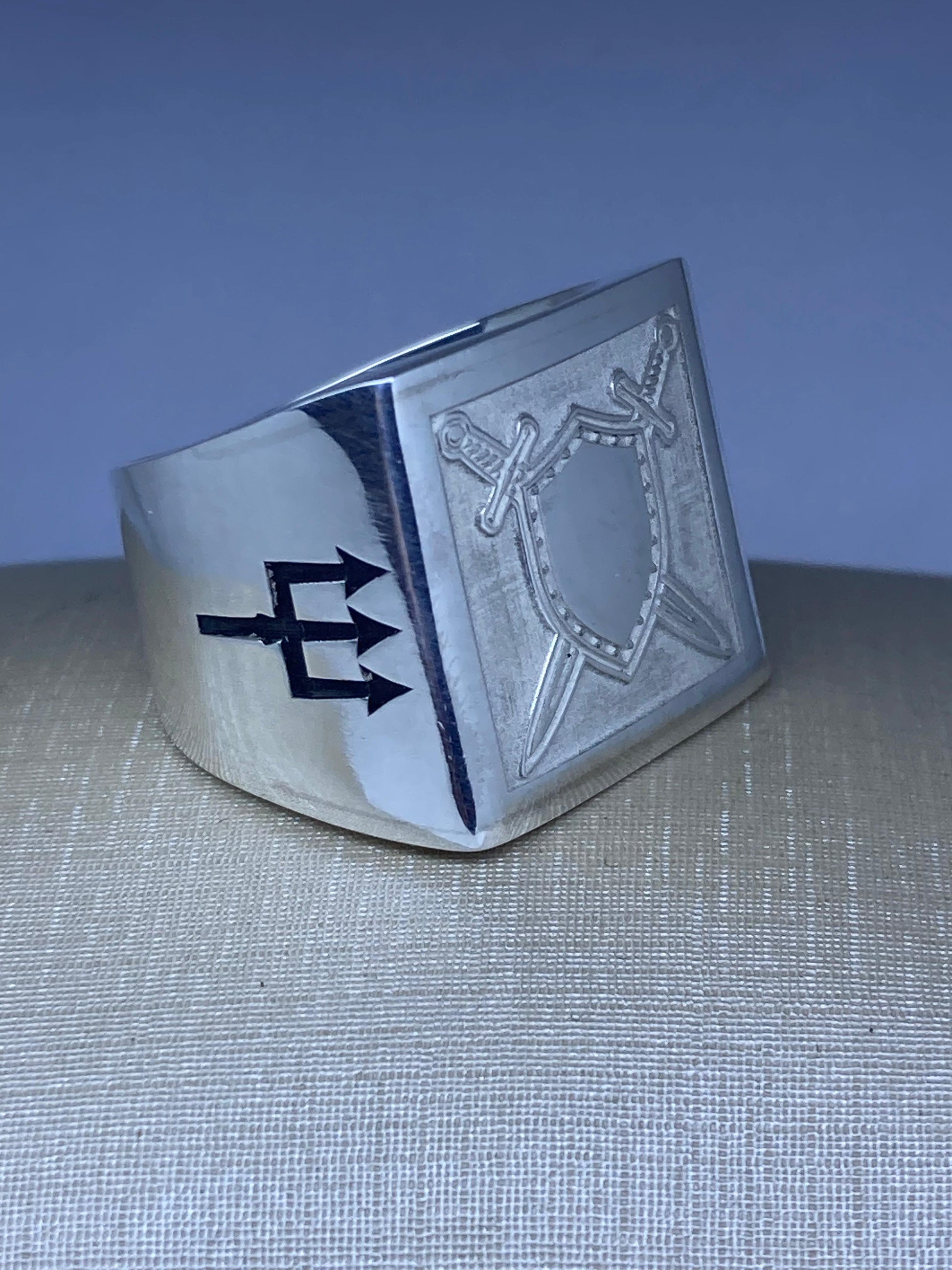 Este anel exclusivo une a força guerreira de Ogum, senhor das batalhas e caminhos, com o poder de Exu, guardião das encruzilhadas e mensageiro do axé. Forjado em prata legítima 925, ele traz em destaque o escudo e as espadas de Ogum, símbolos de proteção e vitória, e o tridente de Exu, sinal de poder, movimento e abertura de caminhos.